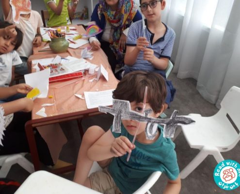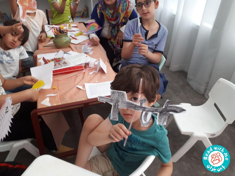 بعد از خواندن در مورد دوستی و دوستان صحبت کردیم و از آنها خواستم تصویر کسی یا چیزی را که دوست دارند روی کاغذهای یکرو سفید نقاشی کنند و دور آن را با قیچی ببرند. از آنها پرسیدم کاغذ کوچک میخواهند یا بزرگ؟ همه بهجز یک نفر گفتند: بزرگ. گفتم: مطمئنید که نقاشیتان بزرگ است؟ گفتند: بله. ولی فقط نقاشی یکی از آنها بزرگ بود. این بود که اشاره کردم بهتر بود در مصرف کاغذ صرفهجویی میکردیم. بعد به آنها یاد دادم که با نی ماسک درست کنند که برایشان خیلی جذاب بود.
